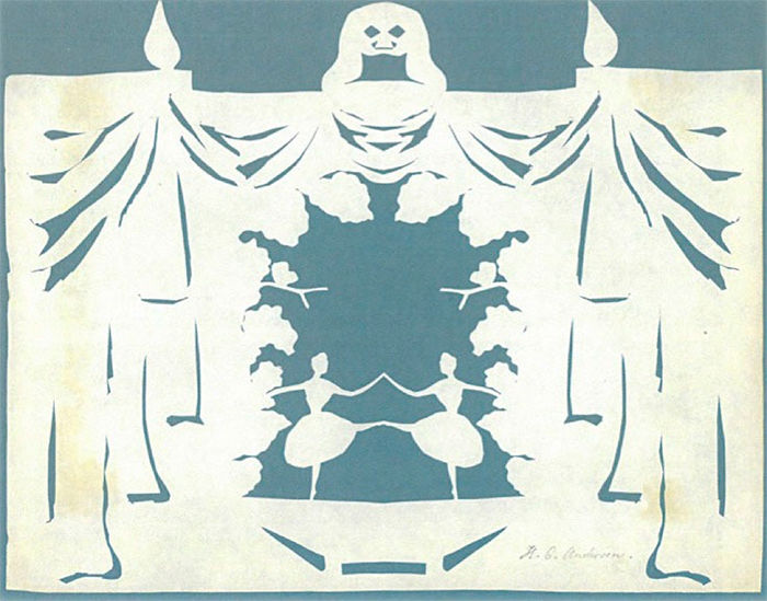 其实除了童话作家、诗人,安徒生还有一个不为人知的身份——剪纸造型艺术家。据说他随身携带一把剪刀,常常一边剪纸,一边为孩童们即兴讲述幻想故事,故事讲到最后他把纸片展开,故事中的人物形象就活灵活现地蹦出来。安徒生这种边说边剪的才能给许多孩子留下了终身难忘的印象。里格默尔·斯坦普是众多观看安徒生表演的孩子之一,她长大后写道,安徒生的剪刀下有“舞蹈的姑娘、天鹅、仙女、鹳鸟、棕榈树、宫殿、庙宇、魔鬼、爱神、天使、美人鱼、巫婆、清真寺、人形风磨、法国哑剧中的丑角皮埃罗等等多姿多彩的主体”。