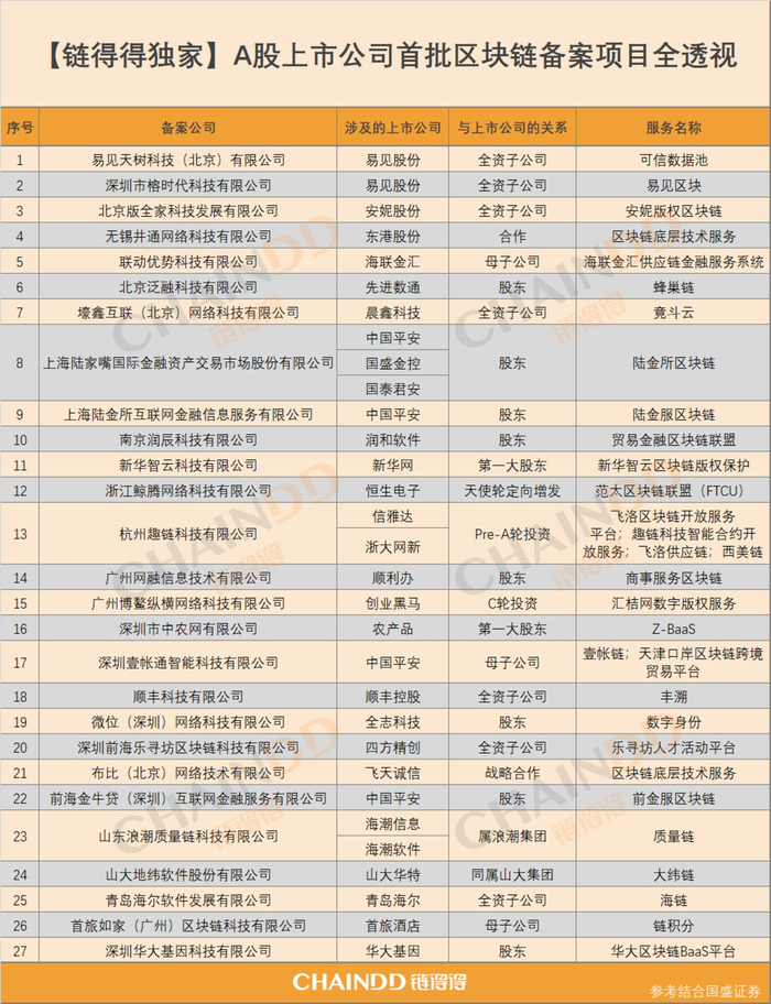 【链得得独家】一文尽览A股上市公司首批区块链备案项目
