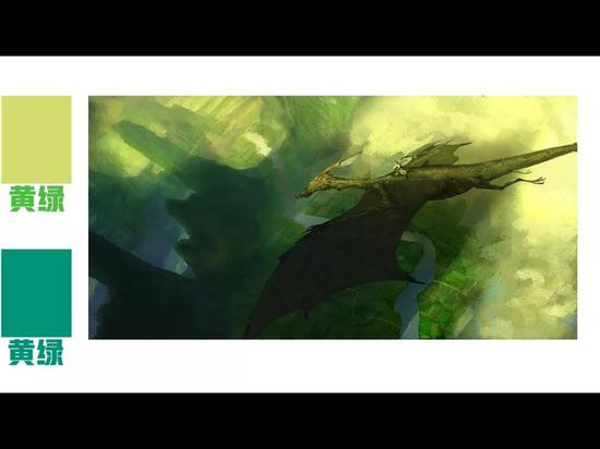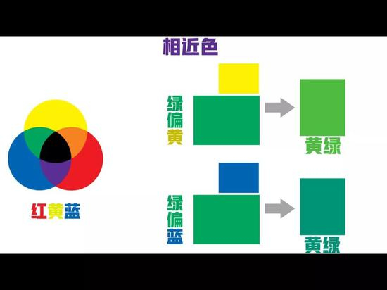 要使用好颜色,除了要使用好补色,对相近色的运用也非常重要。如图,绿偏黄色与绿偏蓝色所得到的两种颜色是微妙的,同为相近色的黄绿色,但又互为补色的关系。