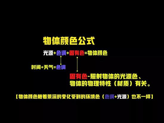 很多人会问某个物体最终在什么环境呈现了一个什么效果,要怎么画呢?是应该偏暖还是偏冷呢?如果不清楚,按照这个公式去推物体颜色肯定不会出错。但里面具体是指哪些,我们来一步一步往下推。