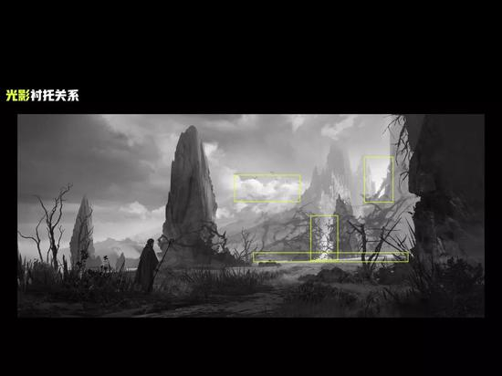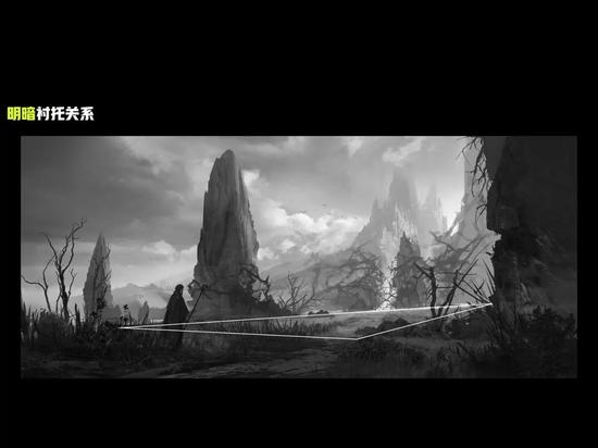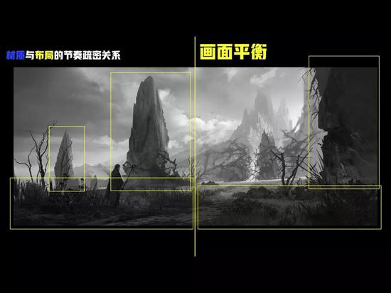 第二是内容的平衡性,例如图中放的一个主体光源,并以此为支撑点来平衡左右两边的画面,左面有一个人物,那么右边可能最后可能要添加一些符文之类的元素,这就产生了内容的平衡性。从画面平衡到内容平衡,逐步达到了布局的平衡, 这就是黑白构成中的布局节奏疏密关系。