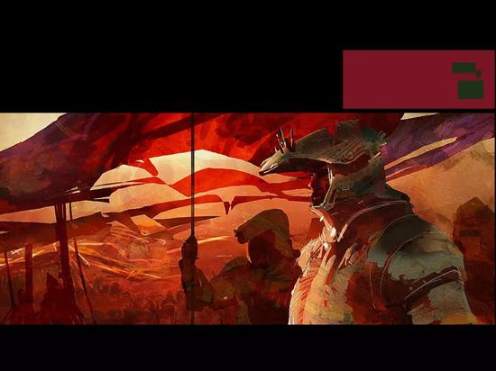 我们来看下他的颜色是怎么用的。首先整个构图中补色面积占的少,整块都是一个黄橙色偏红的黄色的颜色,那它的补色是什么?也就是我们刚才分析出来的最后这两个颜色。它将其运用在了盔甲上这块。吸取了盔甲上的颜色后会发现,虽然明度上有区别,但是跟我们刚才所提到的颜色是一样的,当然在这其中它还受到了环境色,也就是黄昏的影响,所以必须再加上一个红色才能得到对应的补色。