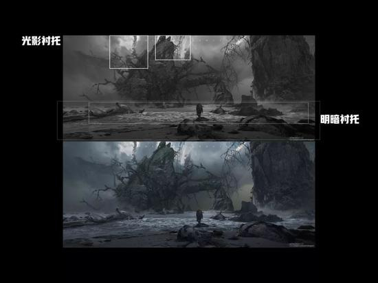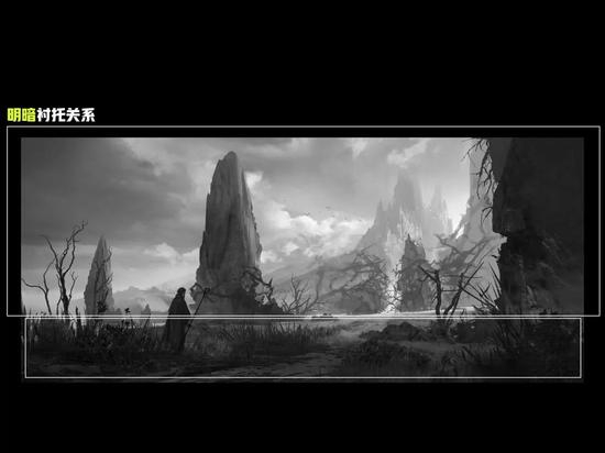 此外,我认为黑白构成还可以表达情绪。很多人会问,没有颜色怎么表达情绪,很多情绪不都是通过颜色带出来的吗?我刚出国的时候,做了一个动画项目,当时被要求画任何东西都必须经过黑白构成,而国内做法就是直接厚涂颜色。国外非常讲究黑白构成,如果你们将来出国接触动画这个行业的话,就会知道他们所有的设计稿,都要经过黑白构成这个阶段才能上色。而上色也是有专人负责不同颜色的处理。而我作为一个概念设计师,最后只画到黑白构成这一阶段,所以我要表达的情绪也要在这一阶段通过上文提到的那些要点来展示。