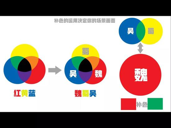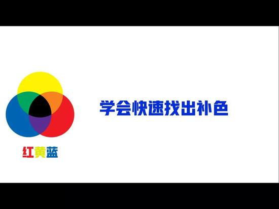 有一个小技巧分享,我们可以把三原色比喻成三国,黄色蜀国,蓝色吴国,红色魏国。当魏国最强大的时候,蜀国和吴国会联合起来,它们联合起来后所得到的兵力,就可以和魏国对抗。蓝色和黄色混合以后得到的绿色,就是红色的补色,你只要记住红黄蓝这三种颜色的补色,其他所有的补色关系你都能很快找出。