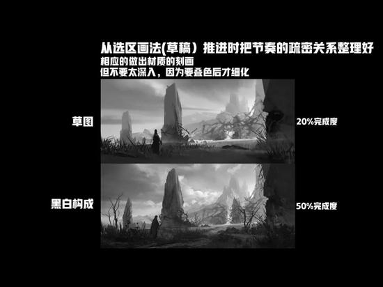 上图是一个完成度20%左右的草图,我们经过明暗衬托、光影衬托、布局的定位等处理后,大概到了50%左右的完成度,这就是黑白构成的必经过程。然后在这个过程中还要不断做调整,如构图里面的一些小系数可能被放大,这些细小的点都代表了节奏关系。我们还要考虑在黑白构成中一般要怎么刻画材质,我们要刻画的点位是什么样的。