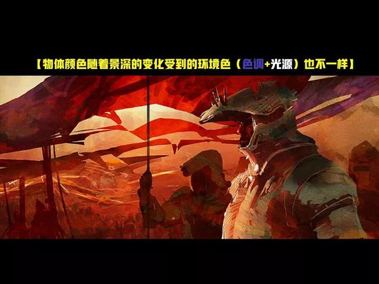 比如这张图中,物体的颜色是红色,但是随着景深的变化,其色调也随着推移变深,最后呈现出来的在光源下的颜色也就产生了差别。这也是在颜色感知上要注意的,景深对物体固有色的影响。而明度,作为色相的明暗差别(深浅差别)对颜色产生的影响大家也都了解,这里就不多做阐述了。