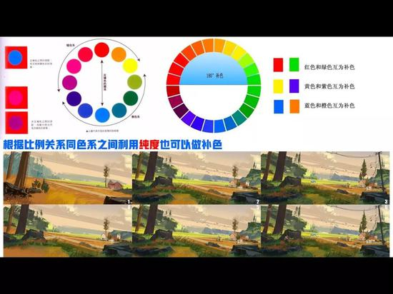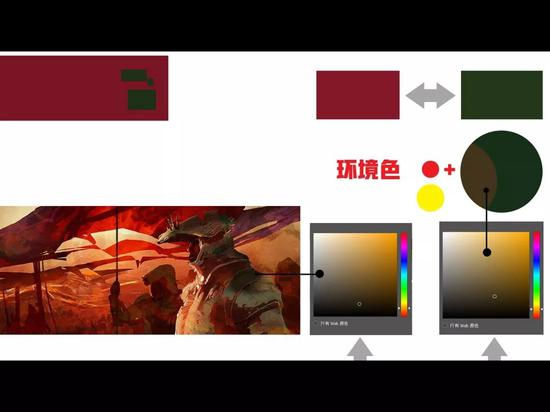再来分析加入了环境色后复杂一点的图。比如这里的图中所标处的砖红色,要怎么快速找到它的补色呢?回想刚才说到的绿色是红色的补色,那么你把红色找出来,两者混合就变成暗红了。然后这里的绿色变化后,靠近蓝色或者紫色,你也就将红色加上暗紫色,来形成一个补色关系。