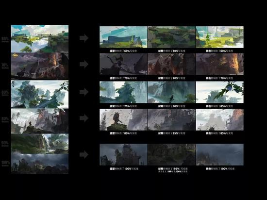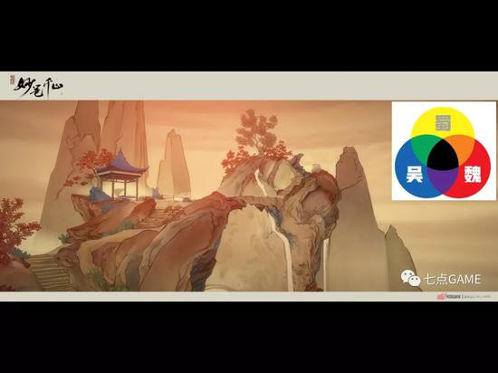 在后面的色调以及山石,云影的处理中则需要注意整个厚涂技法,首先要判断写实度,然后再铺大块色,从这一步开始到中期跟黑白构成做的事情是一样的,在这个阶段我们要据我们的画风匹配好山石、云等自然元素的样貌。