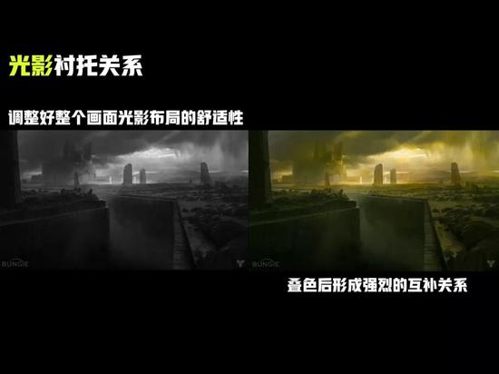 如图,这张图先进行黑白关系处理,然后再叠色后,这个颜色会非常微妙,最后呈现出我们想要看到的那种很酷的场景效果。很多人一上来就直接画,最后肯定无法得到这样的画面效果。因为它前期经历过明暗的处布局,然后是光影的布局,这些处理好了之后,再叠了几个颜色,才能呈现出这样的效果。除了叠色,我们其实还往上面加了很多主观的颜色,所以说我们深入的时候必须经过黑白稿,然后进行观察。在这里我也列了一个简单的小方法: