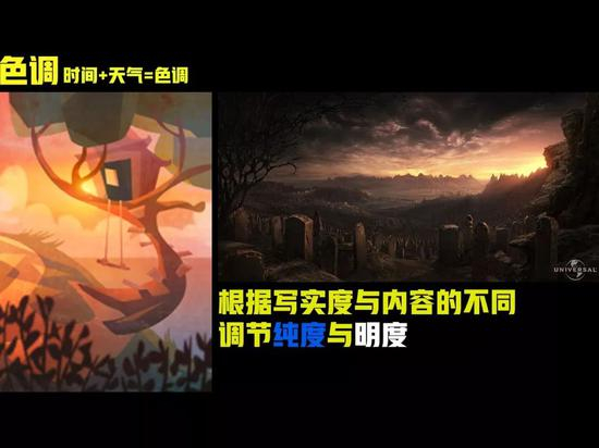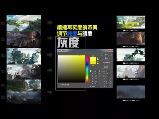 从左边的动画效果所呈现出来的色调到右边的写实度高的电影场景中所展现的色调相比之间的差异。我们发现系数提升时,灰度也会逐步下降,色调跟材质,造型这些因素将直接影响场景最后显示出来的系数,因此这个环节是不能出差错的。放到Photoshop中看,就是纯度和明度的控制,也就是灰度的控制。