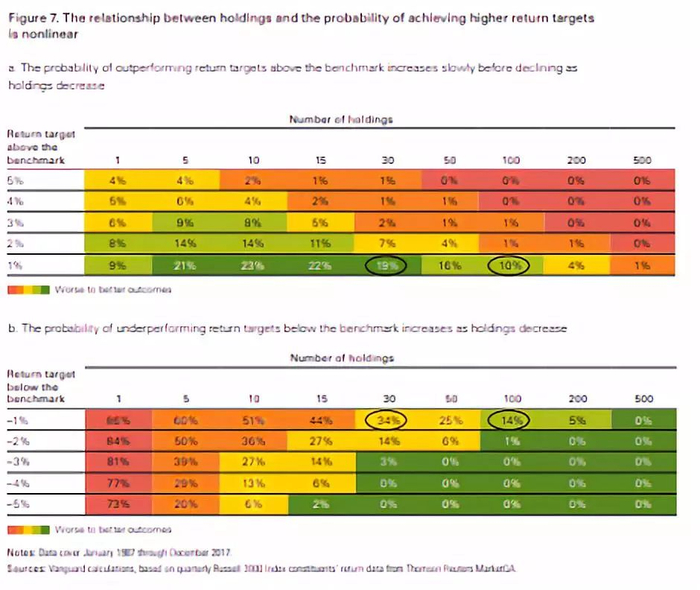 一些投资策略师主张把集中度高、拥有“最佳理念”的投资组合作为表现优于大盘的可靠途径。先锋领航使用模拟和实证分析来评估投资组合多元化与业绩优异之间的关系,发现高集中度非但不会提高、反而会降低胜算。一个投资组合的多元化程度越低,就越不可能持有占市场长期回报大部分的那一小部分股票。