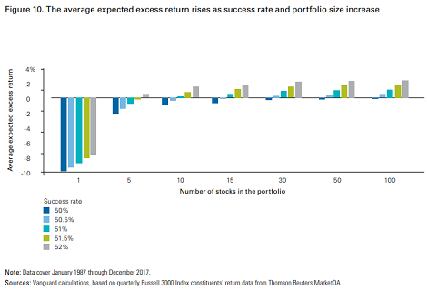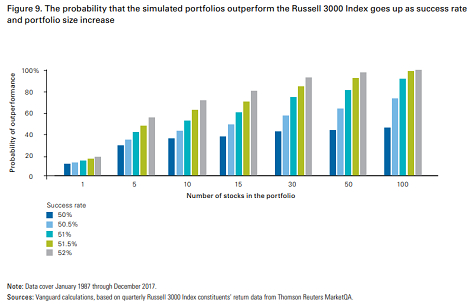 Figure 9显示,更大的成功率和多元化程度,都与表现优异的更高几率相关。然而,在报告作者的模拟中,多元化的影响似乎更强大。即使在52%的成功率下,由五只股票组成的投资组合表现超过目标的几率基本上没有超过50%。相比之下,在一个由100只股票组成的投资组合中,同样的成功率下,表现超过目标的几率却几乎达到了100%。