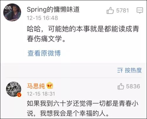 有网友嘲讽马思纯什么书都能读成青春伤痛文学,马思纯出现在评论里,表示“如果我六十岁还觉得一切都是青春小说,我想我会是个幸福的人”。