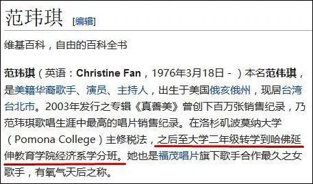 一出道就以“为实现歌手梦想辍学哈佛大学进入演艺圈”作为卖点,忽悠得自己都快信了,却被台媒曝出她口中的“哈佛大学”其实是“哈佛延伸教育学院”,随后她的个人百科资料也全部更正。