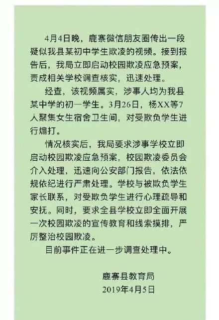 4月4日晚,鹿寨微信朋友圈传出一段疑似我县某初中学生欺凌的视频。接到报告后,我局立即启动校园欺凌应急预案,责成相关学校调查核实,迅速处理。
