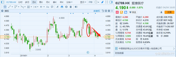 查wind数据能发现,2018年爱康医疗的扣非归母净利润为1.39亿元,同比增34.39%,增速低于2017年1.15个百分点。虽然增速差别不大,但需要注意的是,2017年时,爱康医疗的收入增速为38%左右,但2018年时,收入增速超60%,结果扣非归母净利润却反而有所降低,这其实是低于市场预期的,股价下跌的原因便在于此。