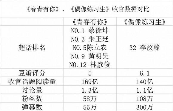 明星资本论对比了《青春有你》和《偶像练习生》的部分数据,除了有《偶练》提前为《青你》造势的阅读量和讨论量之外,脱离《偶练》热度的青你数据全部低迷。截止到一年前,《偶像练习生》的弹幕数高达300万,但《青春有你》目前只有55万。官博粉丝数、豆瓣评分数也相差的明显。