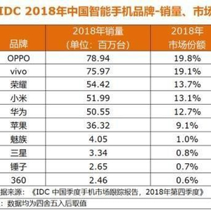 据IDC统计的数据,2018年国内智能机市场容量3.98亿台。在销量上,oppo和vivo勇夺冠亚,远超华为、小米、苹果这些高高在上的手机巨头。