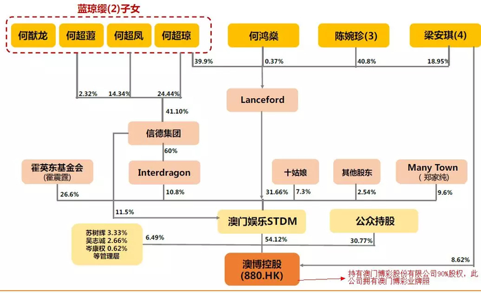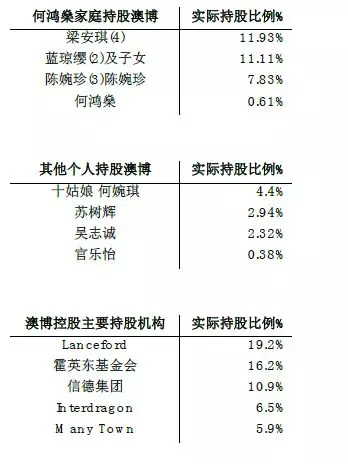 2012年何氏家族争产事件后,何鸿燊原配子女获得浅水湾道一号大宅及30亿港元现金,但并无股份安排,二房太太蓝琼缨子女一方面继续加强对信德集团(0242.HK)以及新濠国际、新濠博亚娱乐(MLCO.US)的控股之外,对于澳博持股也从IPO时的1.1%增至2012年底的11.11%,三房太太陈婉珍获得博彩股澳门励骏(1680.HK)股份之外,对于澳博持股也从IPO时的0.14%增至2012年底的7.83%,四房太太梁安琪则连同新分配的澳娱,合计持有11.93%的澳博股份,为澳博的联席主席,何鸿燊家族一共持有澳博31.48%股份。