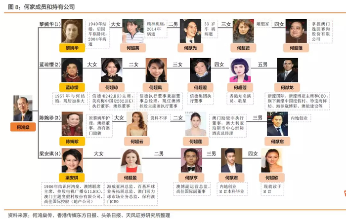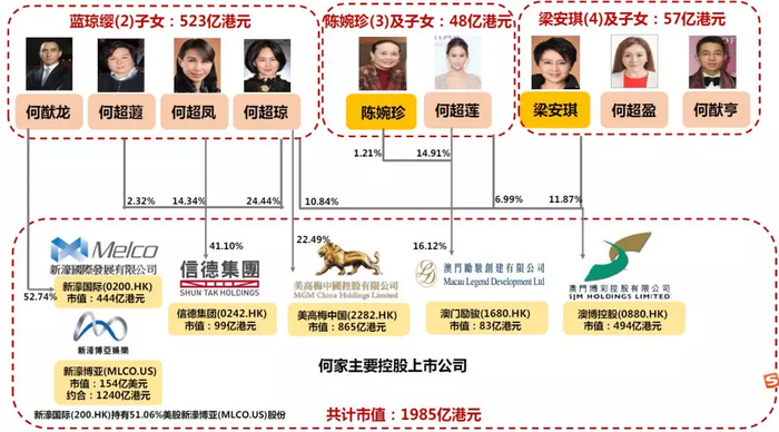 二房太太蓝琼缨长子何猷龙控制的新濠国际发展(0200.HK),目前总市值为302亿港元,新濠博亚娱乐(MLCO.US)目前总市值为116亿美元,二房女儿何超蕸、何超凤、何超琼合计持有41.1%的信德集团,目前总市值106亿港元,何超琼持有22%股权的美高梅中国,目前总市值665亿港元。