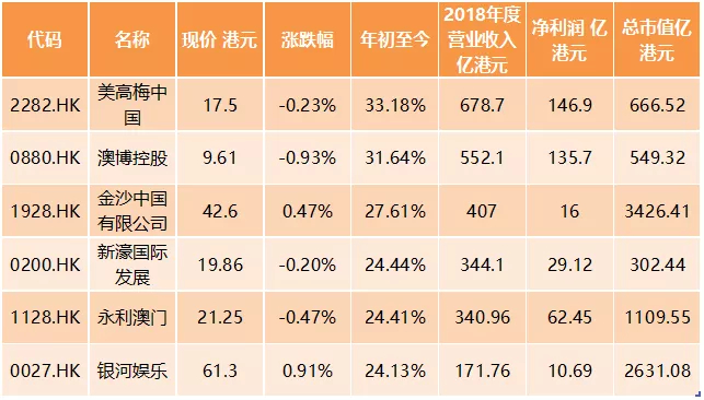 澳门6大博彩公司早已在香港上市,分别为澳博控股、永利澳门、银河娱乐、美高梅中国、新濠国际发展、金沙中国。Wind数据显示,年初以来这六大博彩股都呈现20%以上的涨幅,其中美高梅中国以及澳博控股涨幅分别为33.18%、31.64%。