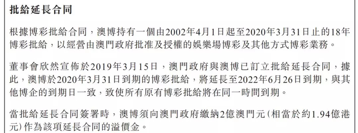 澳博控股持有一张由2002年4月1日起至2020年3月31日止的18年博彩赌牌,3月15日,澳门政府与澳博签订了批给延长合同,将延长至2022年6月26日到期,与其他博企的到期日一致。
