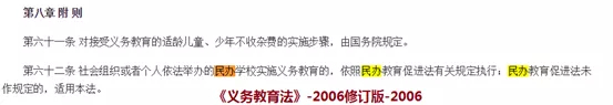 图:《义务教育法》2006年的修订版本,重点提出了“免试入学”和“民办学校适用”