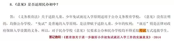 而在之后,随着“减负”大潮,加之《义务教育法》的修订,之后“禁止小升初考试”相关政策持续不断出台,比较有代表意义的是2014年发布的《教育部关于进一步做好小升初免试就近入学工作的实施意见》,其中提到“公办,民办学校均不得采取考试方式选拔学生”,在该政策的发布会上,又再次强调了这一点。