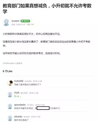 比如有一个非常有意思的说法,叫做“小升初考试”。某著名高知论坛,在孩子教育板块,有人义愤填膺的发帖“教育部门如果真的想减负,小升初就不允许考数学”,时间是2018年11月,离现在时点是比较近的。