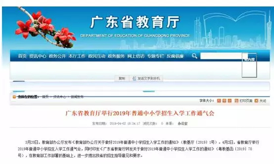 离得最近的是2019年4月2日,广东省教育厅发布的,《举行2019年普通中小学招生入学工作通气会》,提到的“规范义务教育学校招生入学行为,明确民办义务教育学校必须严格遵守义务教育免试入学规定,不得通过考试或变向考试等方式选拔学生”。
