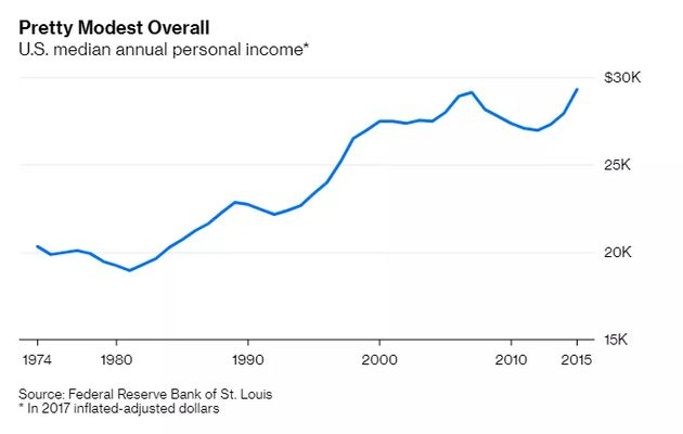 不同学历和行业的美国人,收入差距还是很大的。2017年第四季度,美国人平均年薪是4.4万美元左右;没有高中学历的人群平均年薪只有2.7万美元左右。