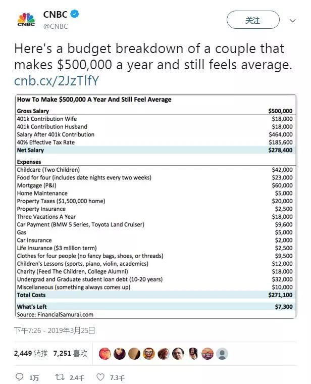 我们可以看到,虽然他们的税前年收入有50万美元,但扣完养老保险(美国称为401K计划)、各种税之后,就只有27.8万(约186.7万人民币)美元了。除去各种花销,最后一年下来居然只能剩7300美元...