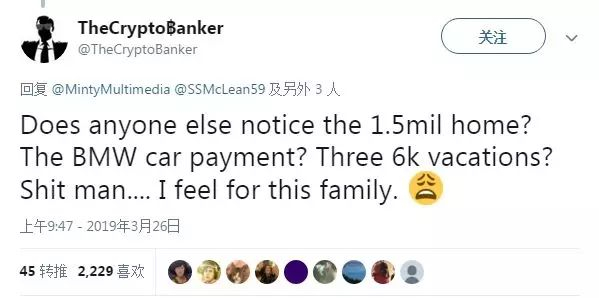 不知道有没有人注意到150万美元的房子?宝马车的首付金额?每年有三次6千美金的度假?我真是对这个家庭表示“同情”。