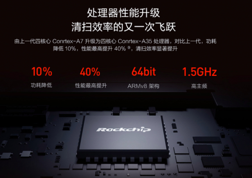 全新四核处理器带来最高40%性能提升,对比上一代,功耗降低10%,清扫效率大幅提升。