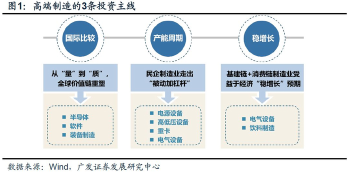 高端制造是政策由“破”转“立”的主要发力方向,也是中国实现全球价值链跃升的关键。高端制造将重塑全球价值链,是大国竞争力的核心。高端制造建议关注3条主线:(1)中国仍处全球“价值链”较低位置的行业:半导体、软件、装备制造;(2)走出“被动加杠杆”的制造业:电源设备、高低压设备、重卡、电气设备;(3)“稳增长”政策对冲的基建链、消费链制造业:电气设备、饮料制造。