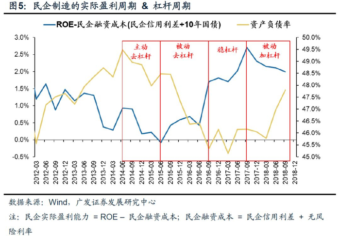(4)“被动加杠杆”,实际盈利能力回落而杠杆率回升(17Q3-18Q3)——民企制造业的实际盈利能力从2.71%回落到2.00%,而杠杆率则从46.2%大幅抬升至47.5%。