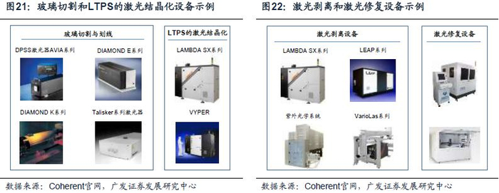 OLED面板:高端智能手机开始普遍采用OLED作为面板选择,OLED渗透率得以快速提升,国产力量在OLED普及过程中也得以快速成长。在OLED面板的制程中,有多道制程与激光有关,包括:TFT背板中关键的低温多晶硅(LTPS)的生产、玻璃和薄膜的切割、直接激光制版、标记、雕刻、焊接等等。