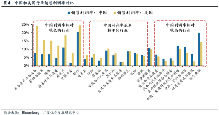 (3)由于市场结构和行业垄断等原因,中国在部分行业的利润率高于美国(耐用品消费业+生物医疗业+金融行业):汽车与汽车零部件、耐用品消费与服务、医疗保健设备与服务、生物技术与生命科学、综合金融。此类行业或者受益于中国消费升级、或者受益于垄断的产业环境,其利润率明显高于美国相应的行业。