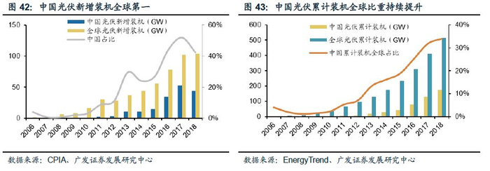 2013-2018年,中国连续6年光伏发电新增装机容量世界排名第一。2013年中国超越日本,成为全球最大的光伏新增装机市场,此后连续6年光伏发电新增装机容量世界排名第一。2017年我国光伏新增装机53.1GW,同比增长53.6%,占全球光伏新增装机一半以上。2018年531政策放缓了国内装机的脚步,但当年中国光伏新增装机仍达到44.26GW,累计装机超过175GW,全球占比持续提升。