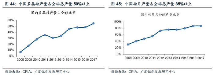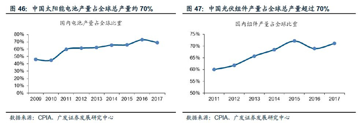 中国已形成成熟且具有竞争力的光伏产业链,中国光伏制造业国际领先。中国光伏产业经过市场洗牌,产业升级,已经形成成熟且具有竞争力的产业链格局。2017年,我国多晶硅产量24.2万吨,占全球总产量44.2万吨的54.75%;硅片产量92GW,占全球总产量105GW的87.3%;太阳能电池产量72GW,占全球总产量104.3GW的69.03%;电池组件产量达到75GW,占全球总产量105.5GW的71.09%,产业链各环节生产规模全球占比均超过50%,继续位居全球首位。