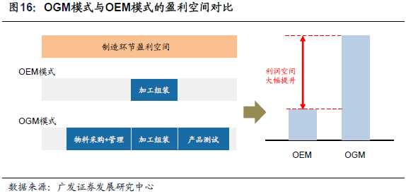 相比OEM厂商止于提供产品制造环节的厂房及人力,OGM厂商将分工环节延伸至上游高附加值领域。OEM厂商由于只负责生产制造(不包括产品测试)环节,只需要提供厂房和人力,资本和技术要求较低,创造价值的空间有限。而在OGM模式中,受托方占据价值链中原材料管理和生产制造两大环节,既可通过优化物料采购和库存管理方案来节省成本,也可借助通过测试的高品质成品在生产环节中获得更高的收益。因此,除了加工组装的代工费,物料管理和成品检测两大环节助力OGM厂商的利润规模远超OEM。