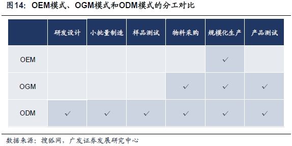 与ODM相比,OGM厂商不负责产品的设计和研发,只负责按照委托方的样品方案模板,实施完整的产品生产流程。与OEM相比,OGM厂商除了提供厂房和劳动力之外,还负责原材料的采购和新产品的封装测试等全套生产服务,向下游交付的是可被检测的产品,而OEM则仅仅负责生产加工这一道工序。
