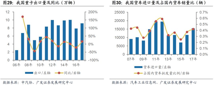 此外,国内龙头公司心无旁骛做主业,产品不仅是国内重卡的绝对主流,也已具备国际竞争力。我国重卡行业出口规模较大,同时国内市场基本被自主品牌占据:根据中汽协数据,17年我国出口重卡9.2万辆,11-17年基本维持在8-10万辆左右的出口水平;而进口方面,根据汽车工业信息网数据,17年包括重卡、中卡、轻卡等在内的货车进口量为1.5万辆,仅相当于17年国内卡车销量的0.4%。