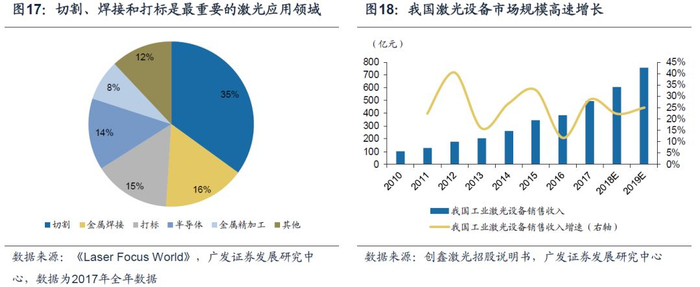 3.1 激光设备:行业持续快速成长,在电子产业有着重要应用在材料加工领域,激光按用途分类(以全球激光器市场为例)则主要可分为切割、焊接、打标、半导体、精加工等细分领域。其中,切割(2017年占比35%)、金属焊接(16%)和打标(15%)是最重要的三个细分领域。我国激光设备产业快速成长,根据创鑫激光招股说明书,2017年我国激光设备规模达到495亿元,对应增速28.57%,2018年和2019年预计市场规模605亿元和756亿元,对应增速22.22%和24.96%。