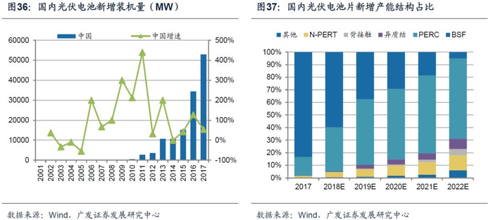 新增产能中,高效率电池片P-PERC占比逐步提升。根据2017年《中国光伏产业发展路线图》统计,2017年(Al-BSF)电池市场占比达83%,占据主要的市场份额,由于这种电池技术性能良好,且生产成本较低,到2018年,PERC工艺电池占比有望接近40%,2019年达到60%占比。