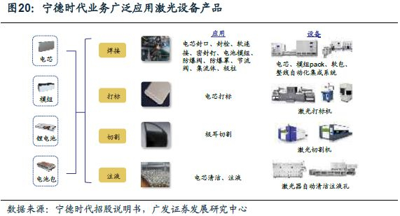 新能源动力电池:动力电池中,电芯、模组、电池PACK等环节大量用到焊接、打标、切割、注液等设备。未来伴随新能源汽车市场的持续扩张,激光设备行业有望跟随新能源动力电池产能不断建设而获得快速成长。
