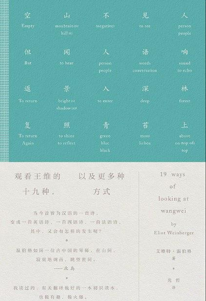 尽管如此,美国翻译家艾略特·温伯格却认为,诗是值得翻译的。好的翻译并不是对原作在形式或语义上的复原,而是将翻译视为一种阐释与交流的方式,在语言的变化中寻找到最贴近“诗意”的表达。在《阅读王维的十九种方式》中,温伯格将《鹿柴》这首五言绝句在1980年以前的十九种版本逐一列出,并进行了细致入微的点评。除了以汉字和拼音写就的原作和一首经过拆解后逐字翻译的英译本外,还涵盖了官方刊物中可见的十三种英译、两种法译和一种西班牙译。作为帕斯、博尔赫斯和北岛的传译者,温伯格通晓中西方文化的差异,对古诗西译也有着独到的见解。在书中,他毫不客气地指出了一些权威译本中存在的致命问题,也有理有据地对比了诸多版本的优劣。这本小书让人确信,阅读王维的方式绝不只有十九种,在不断地翻译、变形和解读的过程中,王维这首《鹿柴》才真正成为了一首跨越时空、贯穿语言的杰出诗作。