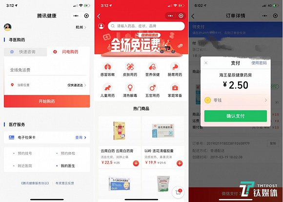 从左到右依次为腾讯健康小程序首页、闪电购药页面、购药支付页面(钛媒体付梦雯制图)