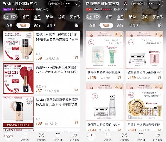 天猫平台上,伊丽莎白·雅顿官方旗舰店拥有368万粉丝,月销过万产品有一个,过千产品有11个,而且该品牌与电商平台合作紧密,会一同推广新品。而彩妆品牌露华浓天猫海外旗舰店的粉丝数只有134万,店内月销售过万的产品只有露华浓豆沙色黑管口红及24小时粉底液,其他月销均只有几百,店内产品数量更新缓慢,2016年9月上线时有33个彩妆产品,2018年8月为48个,目前又调整为34个。