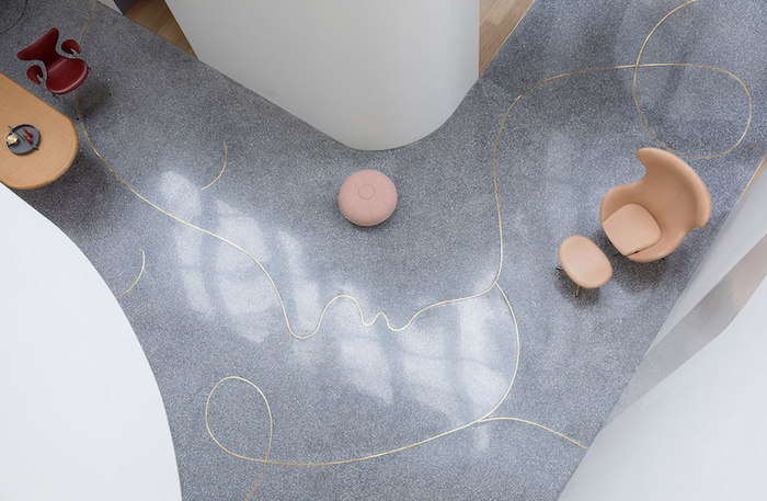 白色的中央大厅以旋转楼梯和灰色水磨石地板为主要元素,地板上镶嵌的、蜿蜒的黄铜线像是一张张抽象的面孔。
